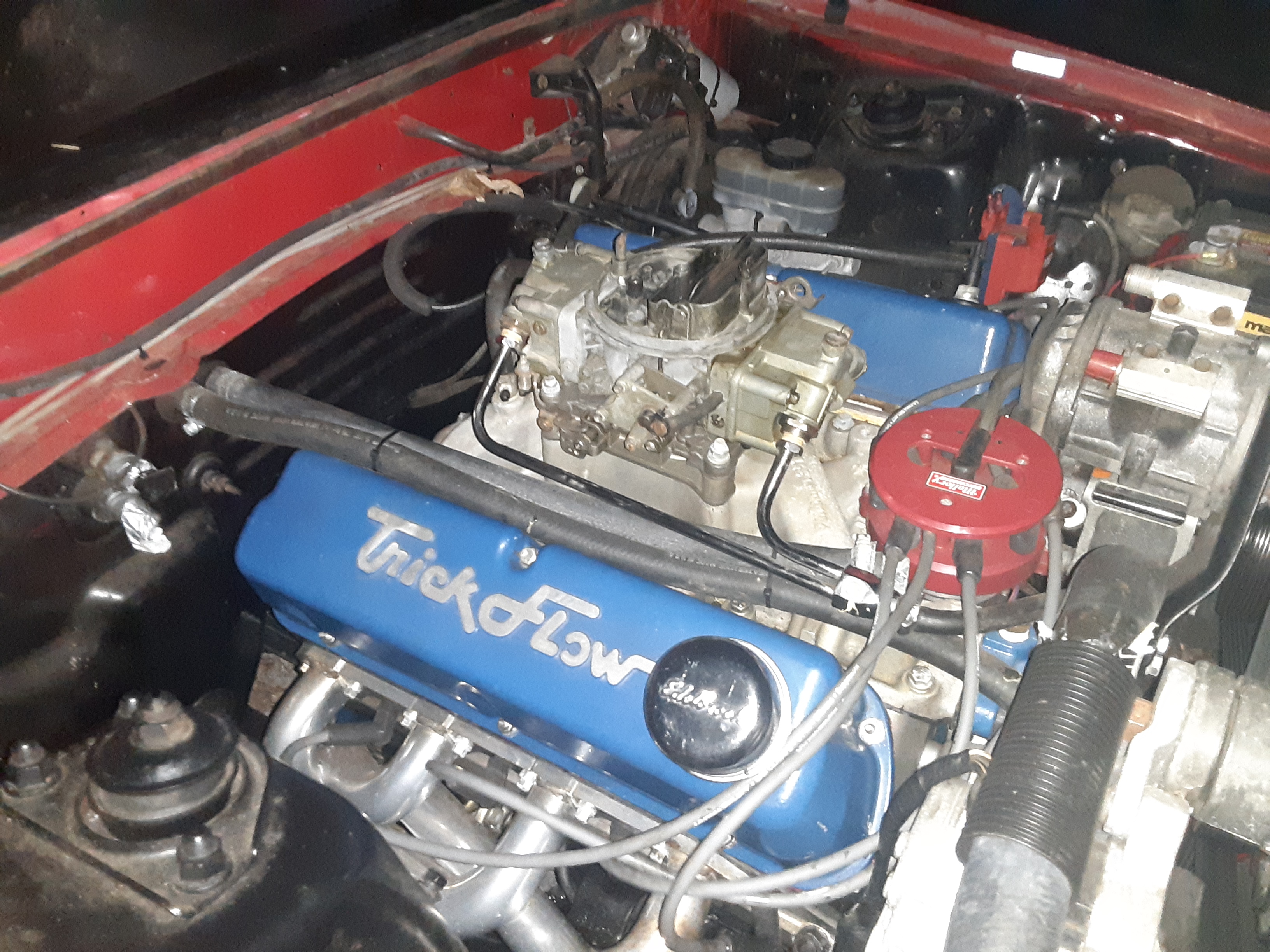 The fiberglass hood with twin scoops helps the 351 breathe easier. The coupe is finished off with beautiful red paint offset by black trim. The interior is all original.
