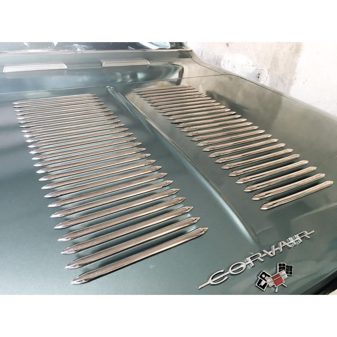 So he’s outfitted his car with some of the specific styling choices that were available at that time from those companies. His Chevy has a Cal Custom rear grill and chrome trim pieces for the louvers on the rear deck lid. The Corvair also has a set of Cal Custom chrome exhaust tips. They’re not Corvair-specific, but Taylor likes them because “they’re In line with the Jetson jet age spirit of the times. They might be triggering to people who like the Euro, less is more look, but I like more is more. And it’s a touch trashy.”