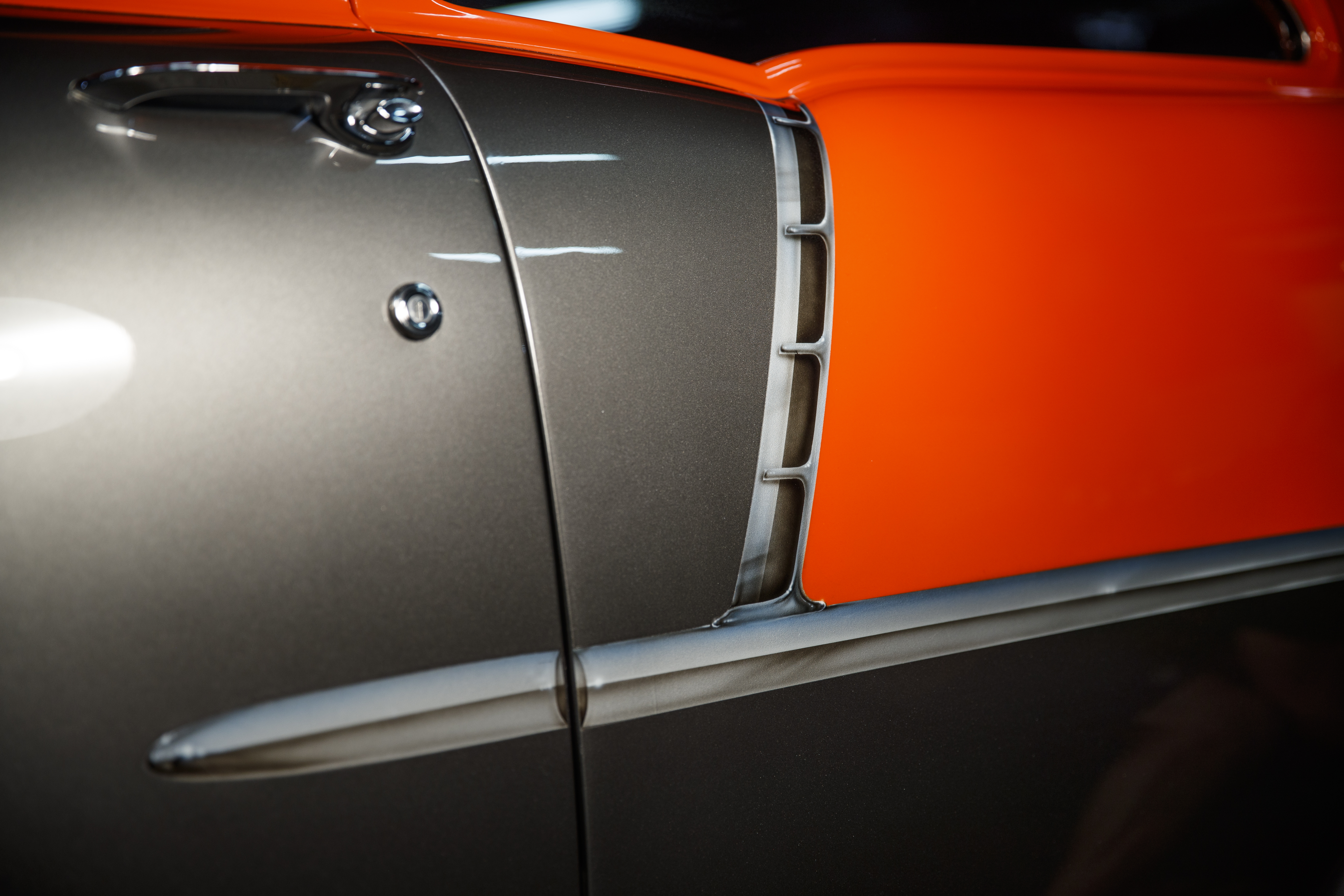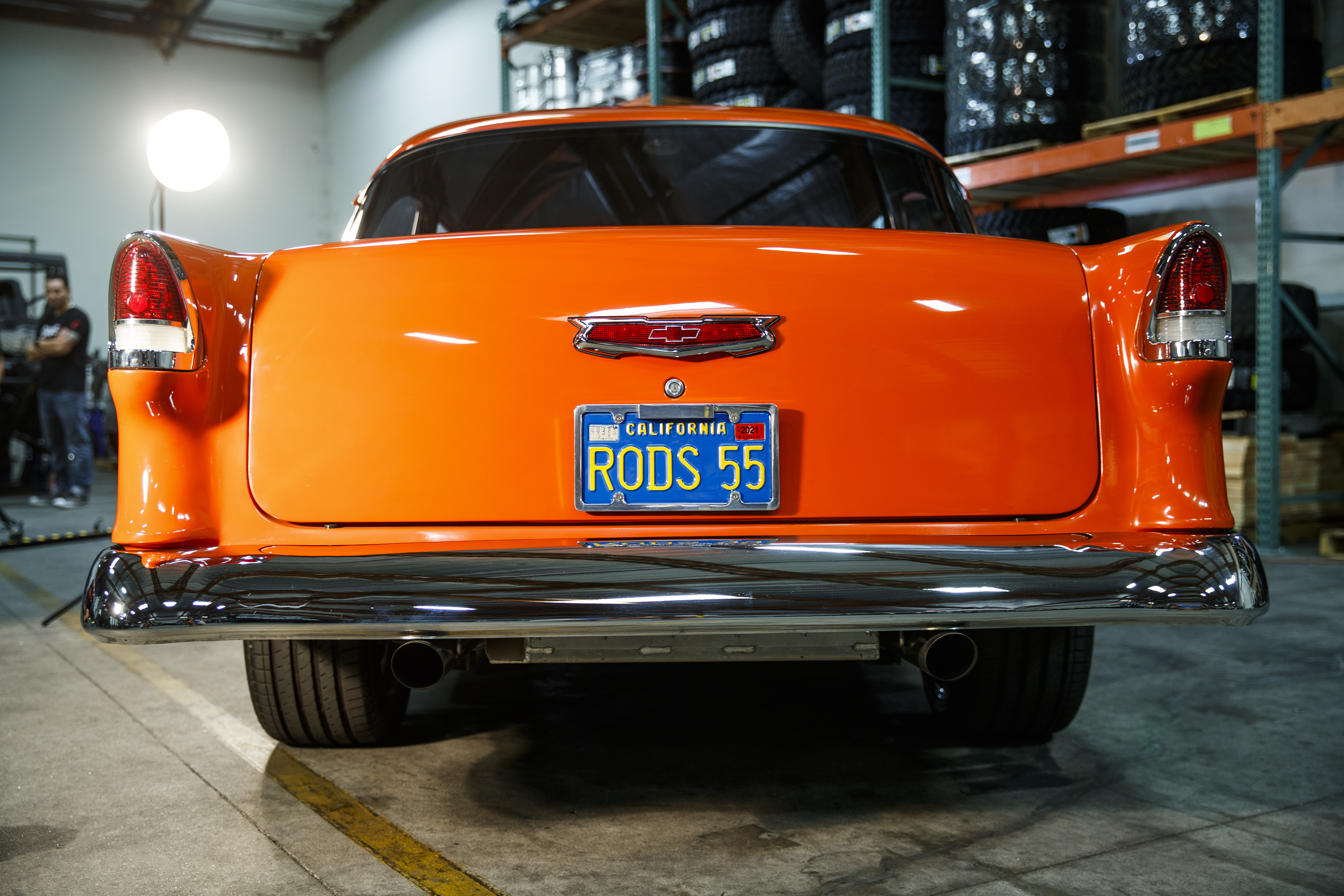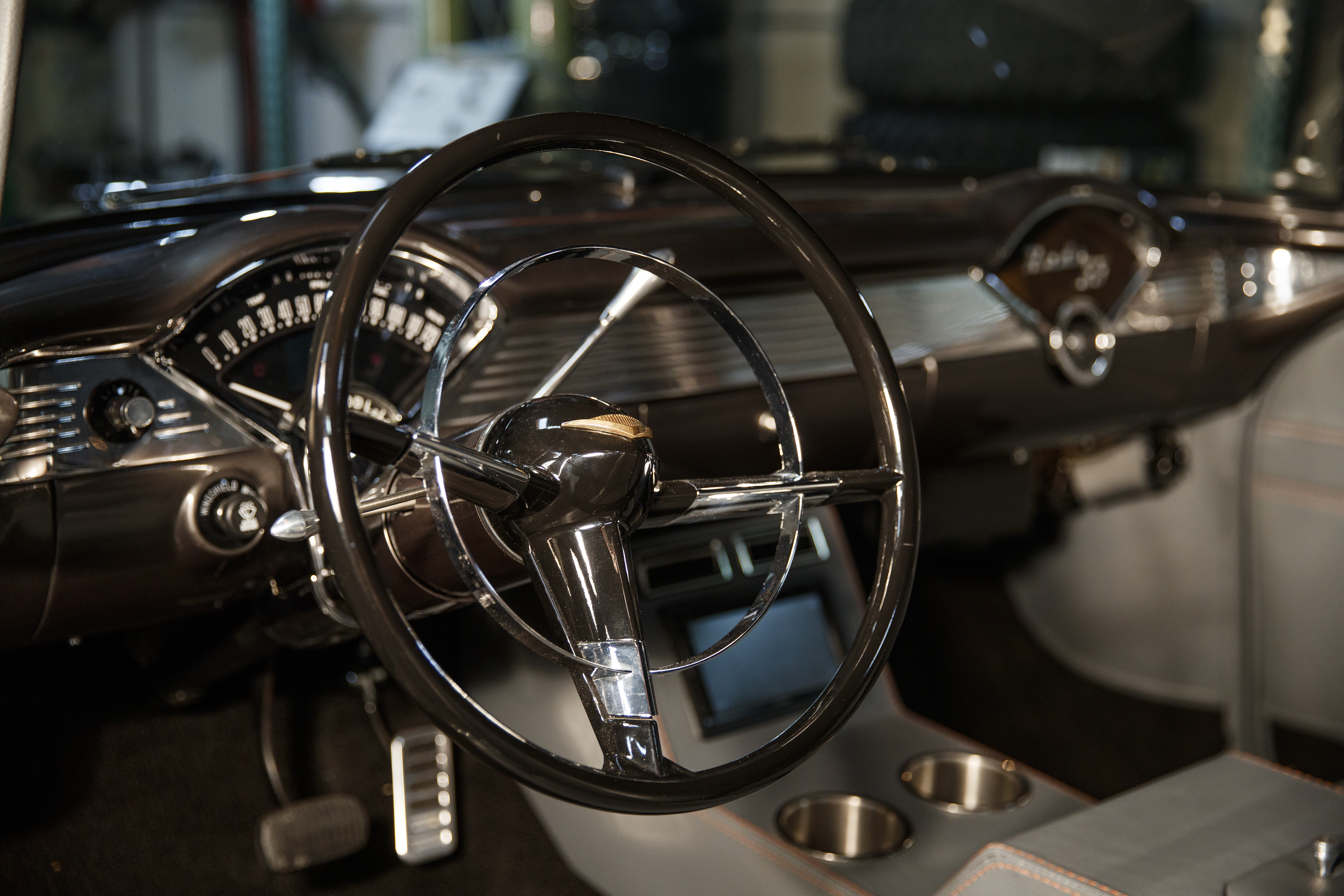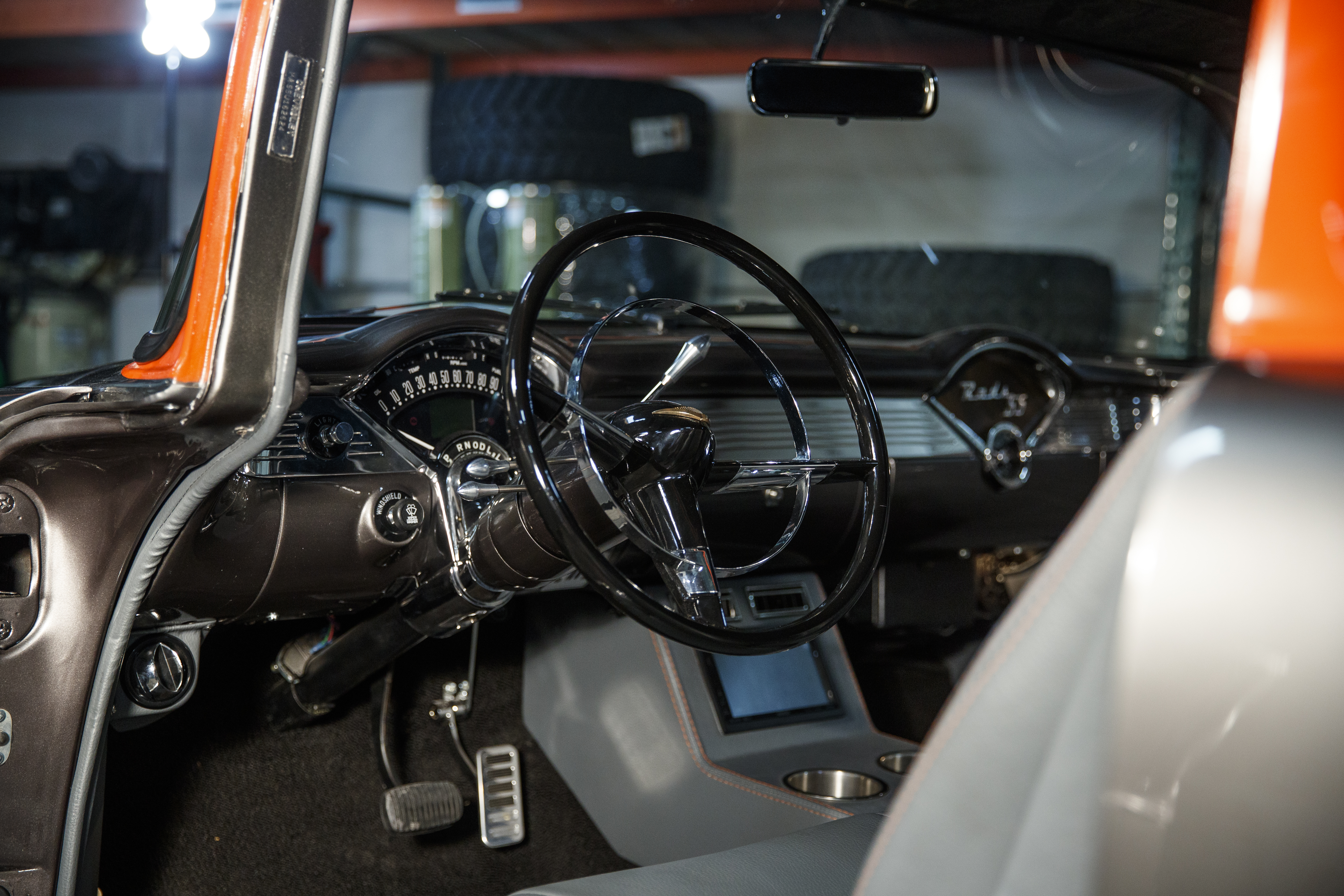 The ‘55 was built to be driven, and the interior JV Enterprise installed reflects that. The front seats are power bucket seats from a Lexus. They’ve been wrapped in gray leather with orange stitching to match the paint. The 700R4 is controlled by a Idid-It Steering column shifter mounted behind an American Retro 15″ wheel on the tilt steering column Rod installed. The Chevy has new black carpet in the interior and trunk.