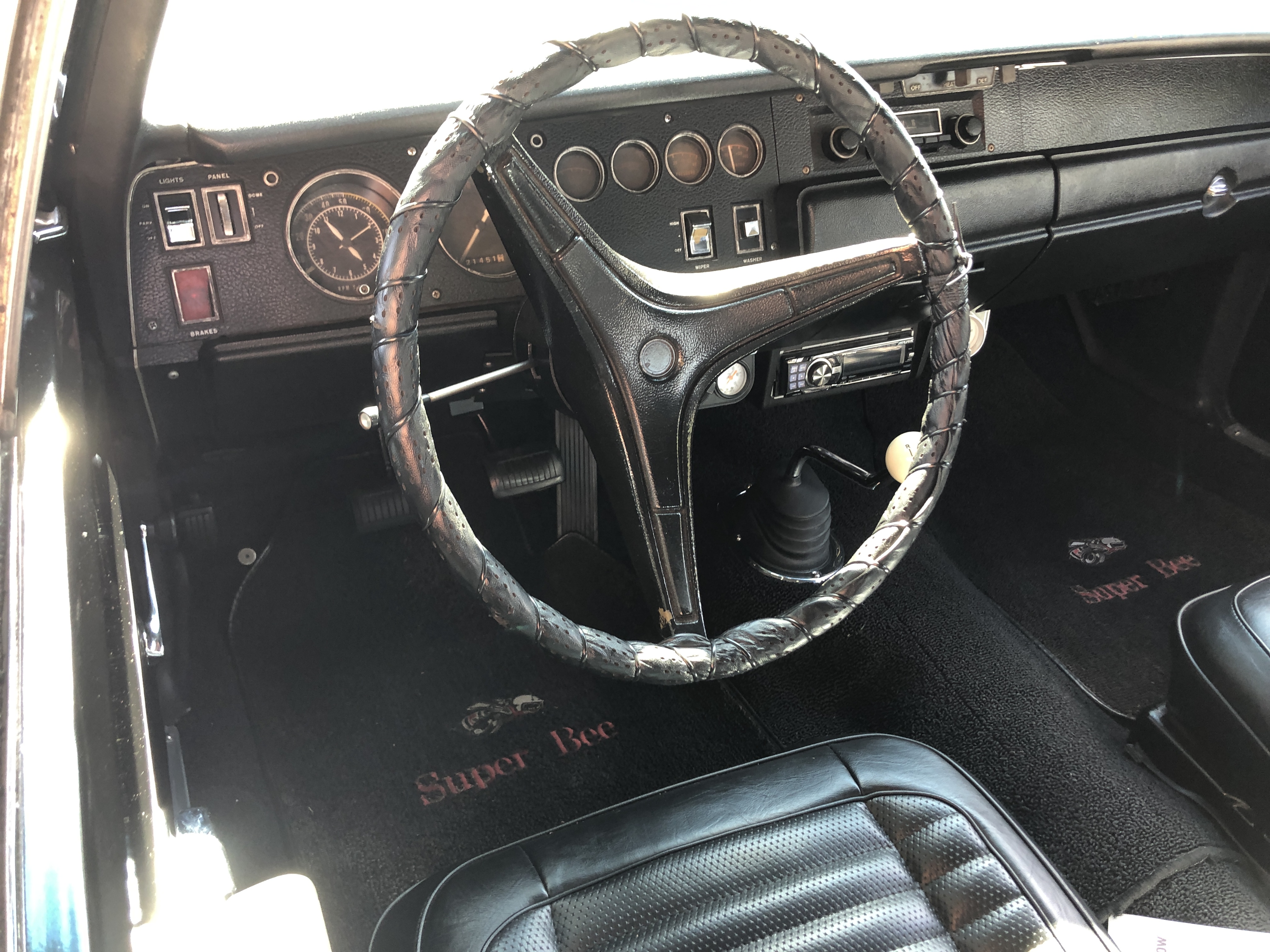 The interior was completely redone last year, with the goal of making it appear factory stock. Doug’s put in new floor pans, sound deadener, carpet, and mats. The new seat covers for the front buckets took over a year to find. The Super Bee did come with shoulder belts from Dodge, but Doug’s replaced them with aftermarket items that are stronger and easier to use.