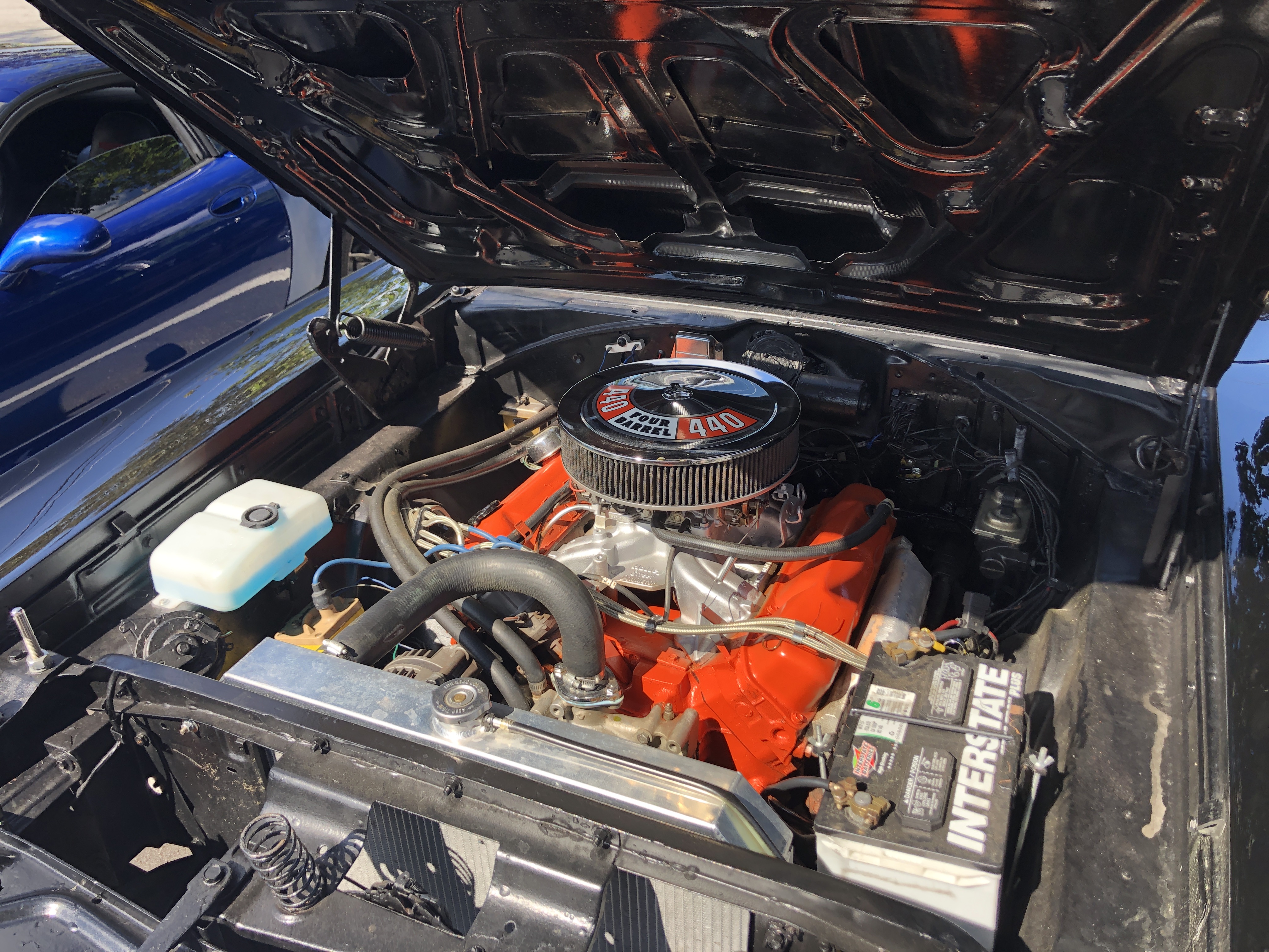 The 440 under the hood is largely stock. It has an 850 cfm Carter AFB four barrel mounted on a single plane Holley Dominator manifold. Doug’s added an Accel Super Coil and aftermarket electronic ignition.