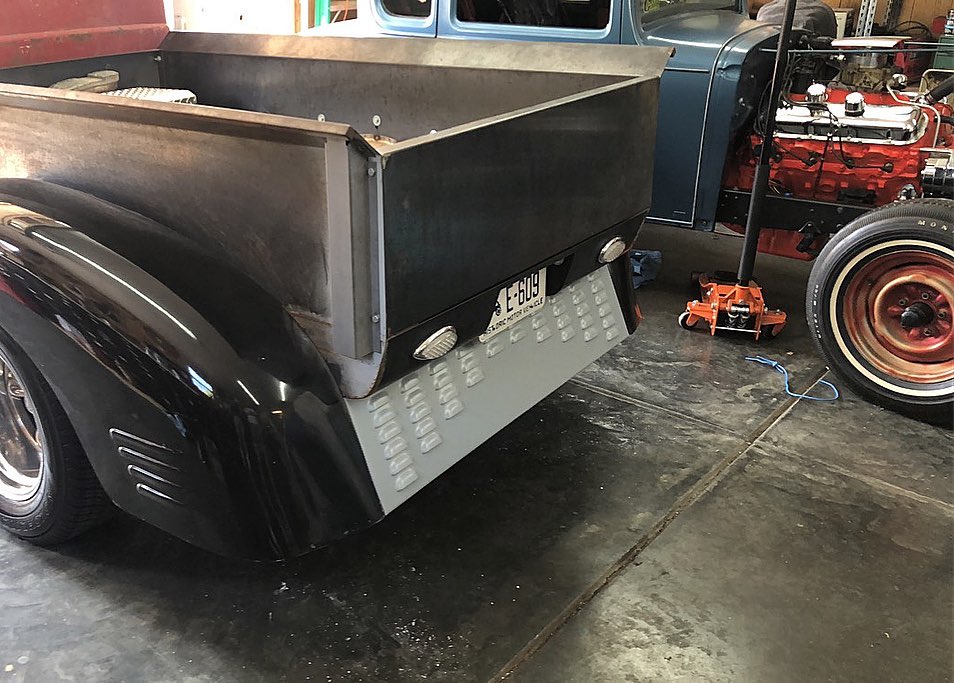 Soon Hunter’s attention will be turned to the Dodge’s cab and body work. He’s going for a smooth look on the truck. He added suicide doors a couple of years ago and got rid of the door handles. He took the Dodge script from a 1954 tailgate and welded it into his tailgate. Future work includes peaking the headlight buckets and trim to match the peaks on the truck’s fenders and frenching in the rear tail lights so they fit flush with the roll pan.