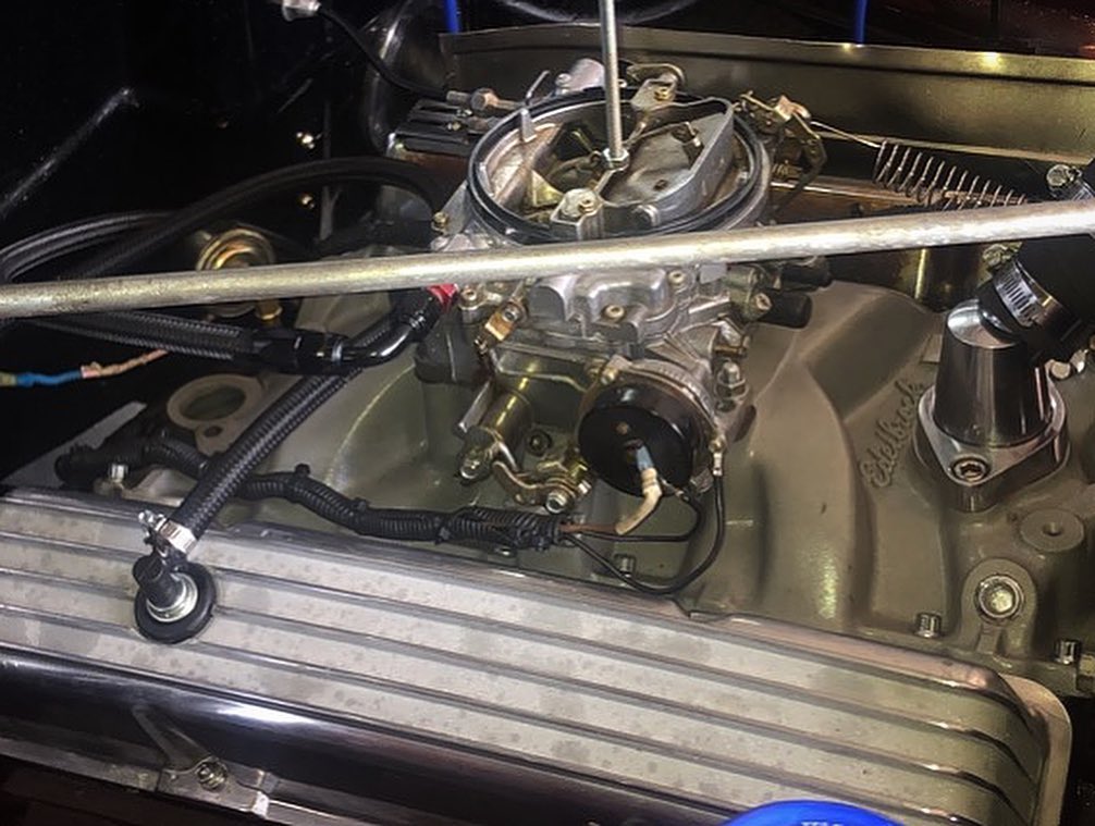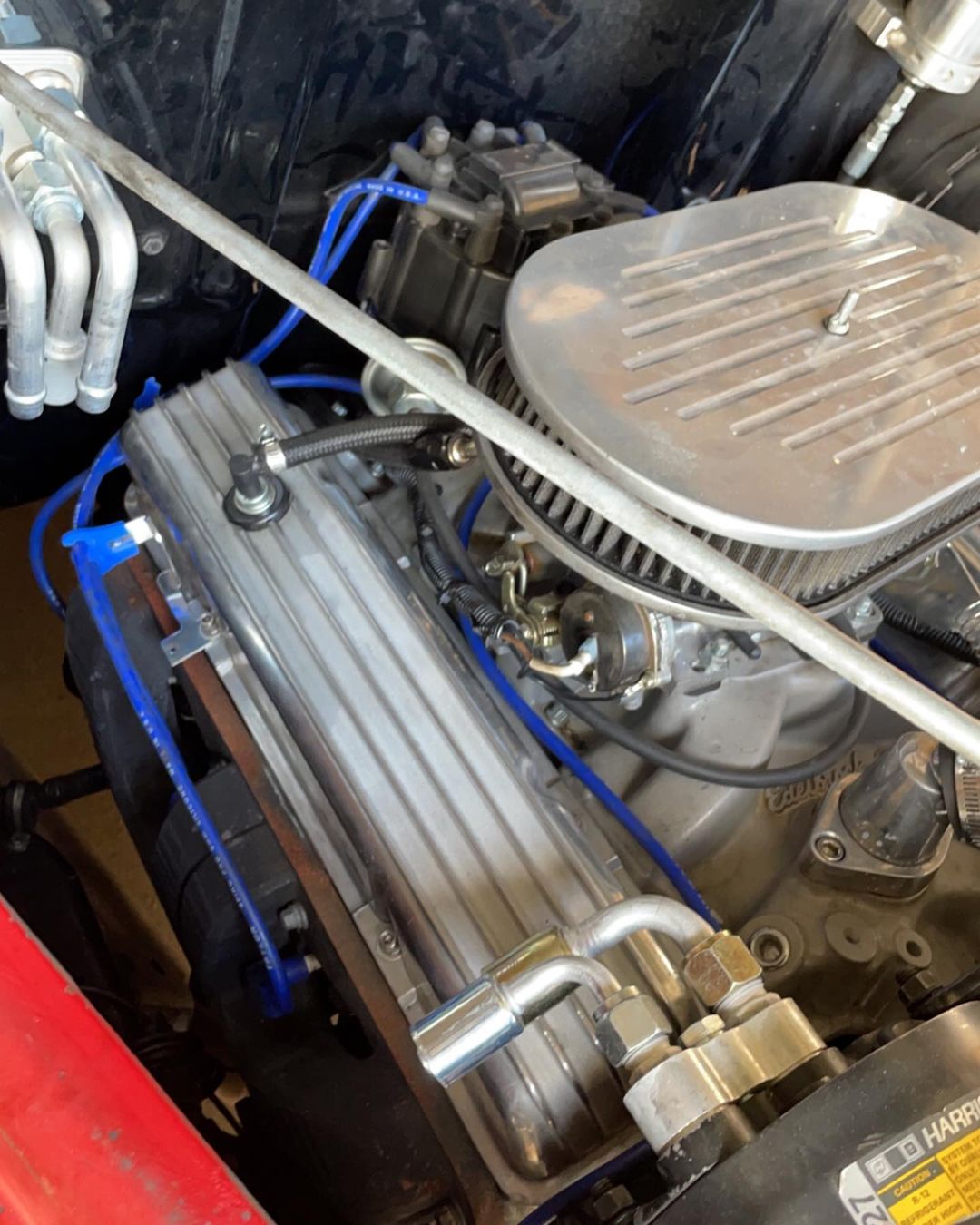 A 305 cubic inch small block Chevy took the place of the 307. It’s basically stock except for an Edelbrock carburetor and a slightly hotter RV valve train Hunter installed, including the cam, lifters, push rods, and rocker arms.