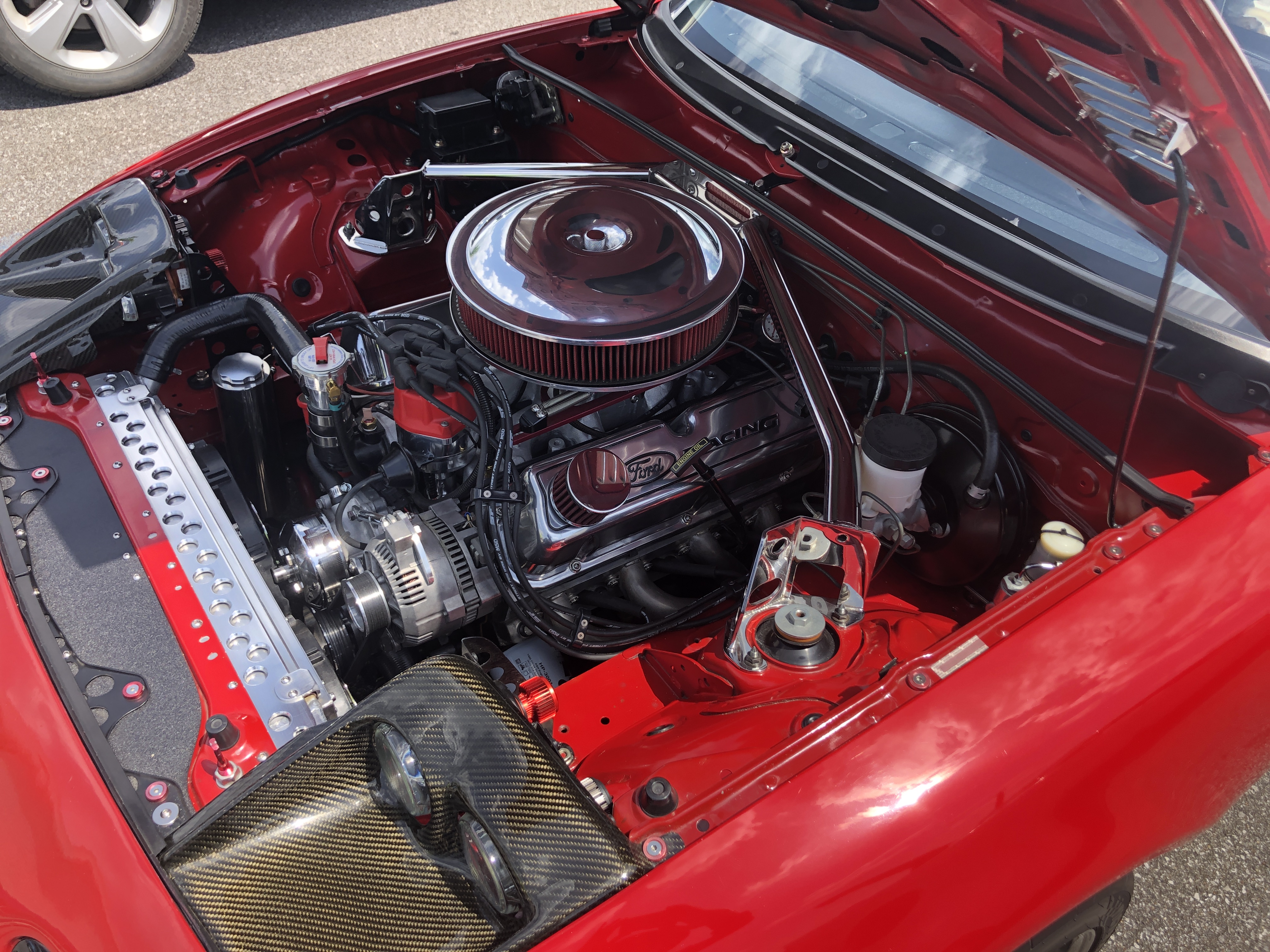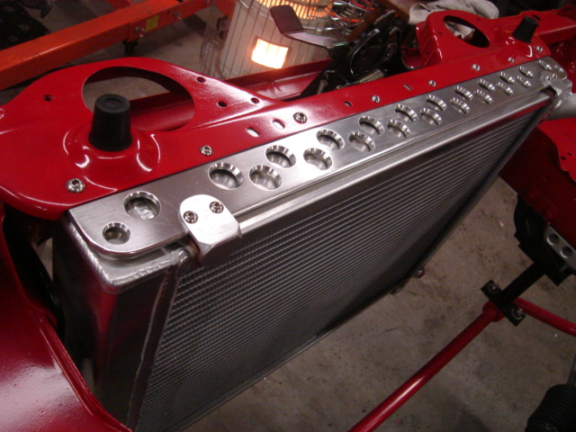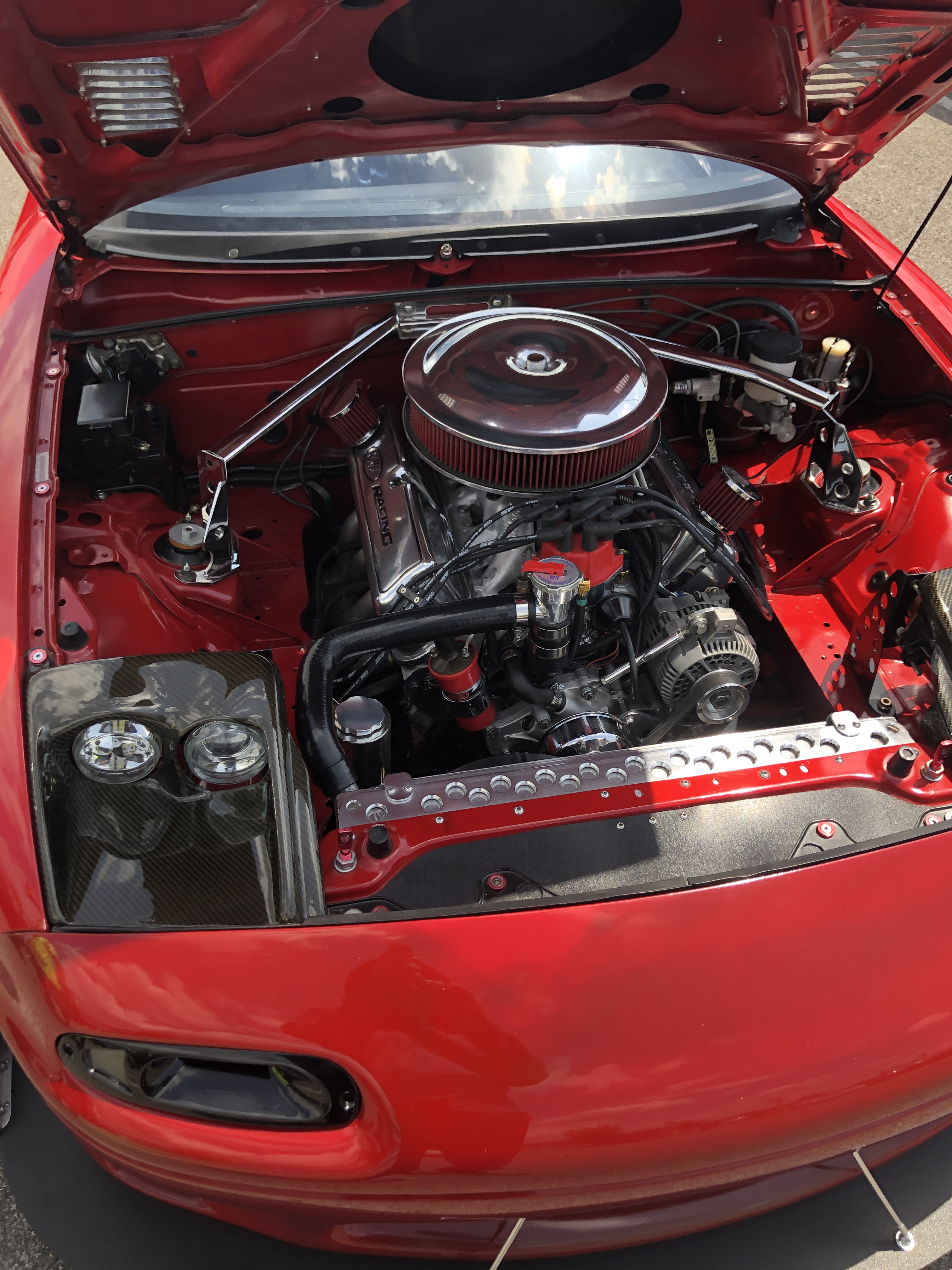 Jerry’s got an MSD electronic ignition and a small case Ford alternator that he had to move to the other side of the engine to get it to fit. The small block’s radiator and headers are from Monster Miata in California.