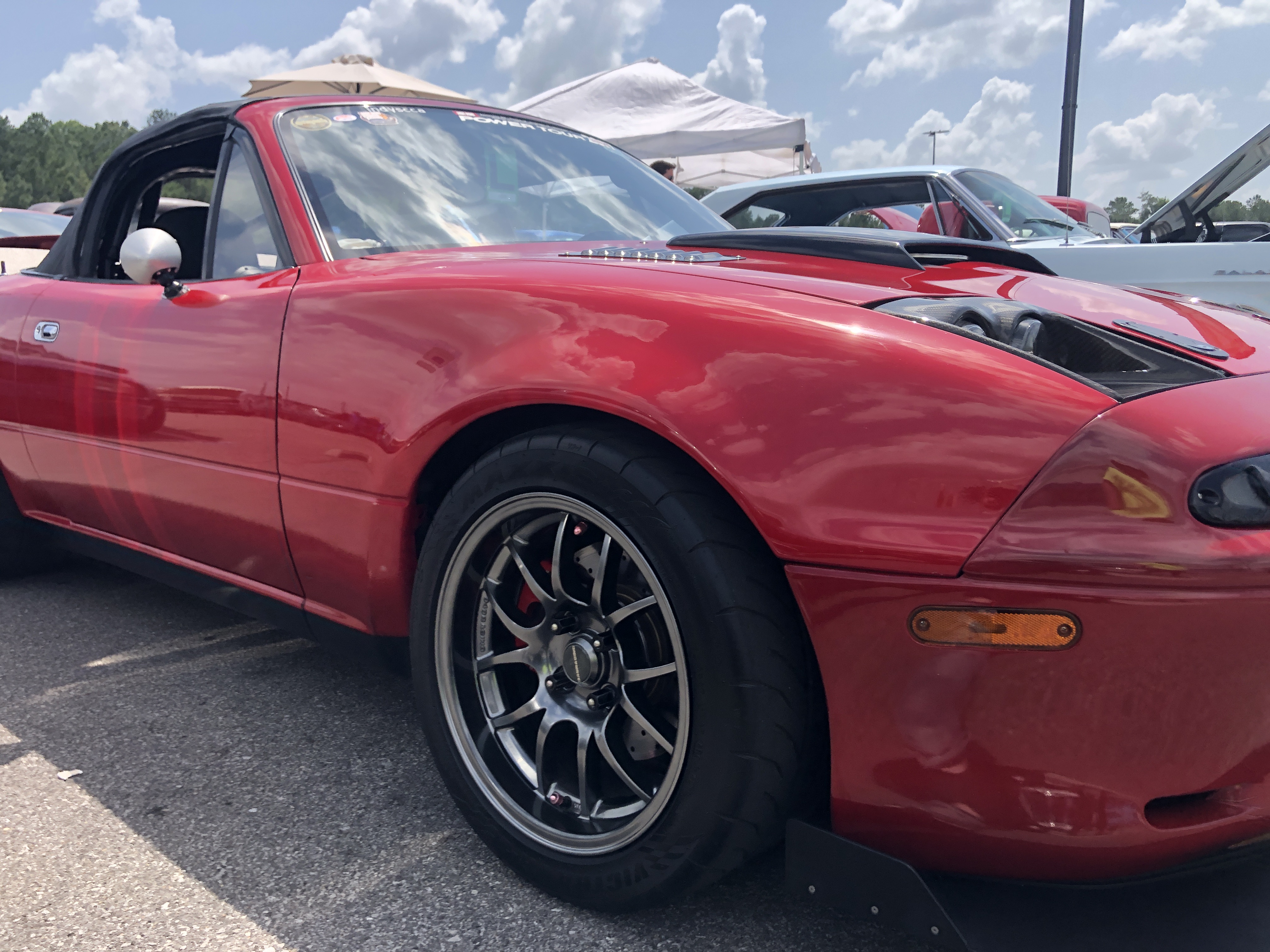 He’s running 245/40/15 Maxxis tires that give him a full 10″ of rubber on the road. Jerry said that’s about the largest tire you can fit into a Miata without doing major work. Just to be sure, all of the fenders have a line-to-line roll on the inner lip to make sure he doesn’t have to worry about cutting a tire.