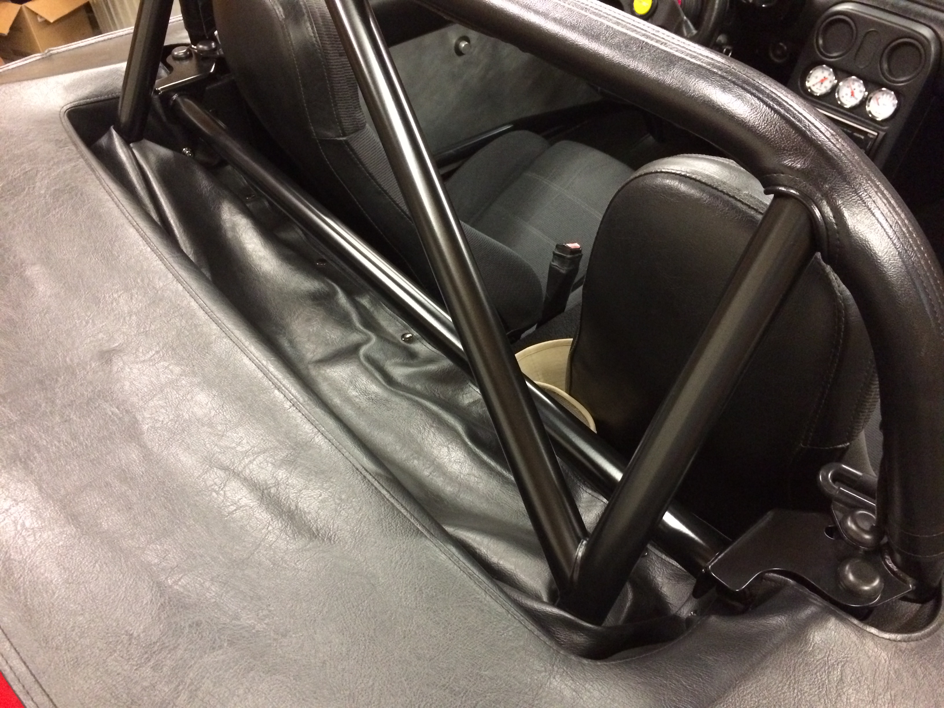 For some added stiffness, he installed a brace under the front fenders that ties the shock towers to the door hinge posts. And the Miata has a fully functional roll bar with a cross bar that ties together the top of the rear door post/seat belt anchor.